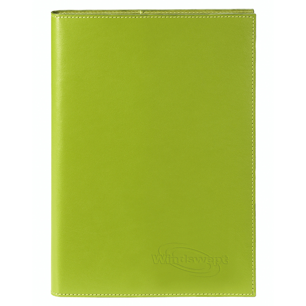 Untreated, sun-dried bonded leather cover. Universal recycling symbol debossed on back cover. Raw bonded leather pen loop. Includes 100 sheets of unlined recycled paper with recycling symbol printed on each page. Four removable metal binder rings for adding and removing pages.